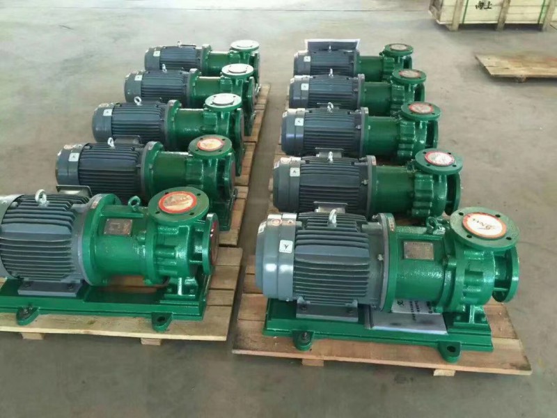 CQB磁力泵通常由電機(jī),磁力偶合器,水冷卻裝置和耐腐蝕離心泵四大部分組成,其主要特點(diǎn)是利用磁力偶合器傳遞動(dòng)力。當(dāng)電動(dòng)機(jī)帶動(dòng)磁力偶合器的外磁鋼旋轉(zhuǎn)時(shí),磁力線穿過間隙和隔離套,作用于內(nèi)磁鋼上,使泵轉(zhuǎn)子與電動(dòng)機(jī)同步旋轉(zhuǎn),無機(jī)械接觸地傳遞扭矩。在泵的動(dòng)力輸入端,由于液體被封閉在靜止的隔離套內(nèi),沒有動(dòng)密封因而無泄漏。磁力偶合器的磁性材料采用耐高溫型稀土永磁材料,能承受280度以下的高溫介質(zhì)而保持強(qiáng)大的磁力扭矩。在電機(jī)與磁力偶合器之間加裝了水冷卻裝置,防止泵送高溫介質(zhì)之熱量傳導(dǎo)至電機(jī),以保持電機(jī)的正常運(yùn)行,從而達(dá)到無泄漏輸送高溫介質(zhì)。